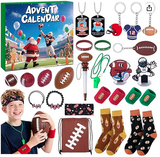 My son loves football. This year I’ve noticed several sports themed advent calendars. These are so perfect for the sports lover in your life. My son loves football for this one pictured above is my favorite of all the options, mostly because he doesn’t have these socks yet. Some of the other football advent calendars have socks he already owns. Most of the calendars include socks, keychains, tiny footballs and other little toys.