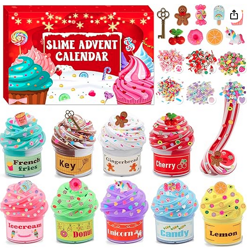 The last kind of advent calendar I want to mention is slime advent calendars. We got one last year and it was so much fun. There were so many slimes as well as add ins for each of them. Some of the slimes were scented, dessert themed, winter themed and some Christmas themed.