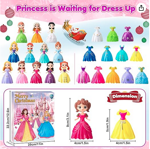 There are many different kinds of princess calendars. You can go for some building block ones, there are ones that have a few dolls and then lots of accessories, the new ones this year that I’m interested in are where you get 12 princess dolls (about 3 inch dolls) and 12 dresses, so you can snap off dresses and mix and match. They are really cute! There are even princess jewelry ones that are really nice.