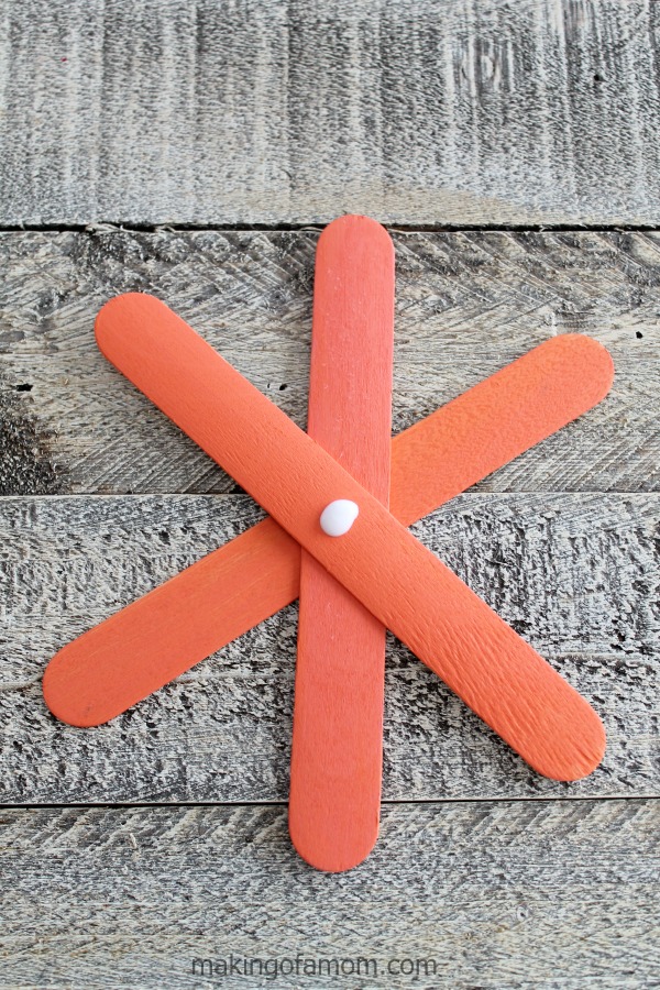 - Once the paint on the sticks is dry you can now glue them. Spread the sticks out so the legs are equally sticking out. Put one drop of glue in the middle of each stick. While the glue is went you can manipulate how spread out you want the legs to be.