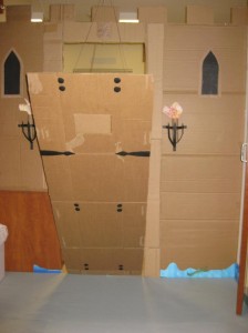 Your castle has a doorway which must be defended. You could build a light drawbridge of cardboard to defend it. To make it work you should attach strings at its top edge that feed through small holes in the upper edges of your castle wall. A small flap at the bottom of your drawbridge could be taped to the floor or stood on when pulling the strings. This would prevent the drawbridge from sliding as you raised and lowered it. If you have a spare set of wooden blinds you could put them on the inside of the castle doorway to act as a portcullis. You could punch two small holes on either side of the door in order to pass a cord or string through and you can tie the blinds firmly above the door. Then the blinds can be raised and lowered to defend the castle and allow access. Of course you should always supervise play and make sure your children are old enough to use blinds properly without danger.