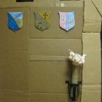 Details provide the most effect. If your castle walls are sturdy enough then you can cut arrow slits or small windows into the walls. If you have time or are artistically inclined you can paint the walls to look like stone and maybe add details such as fireplaces. If you have large enough walls you can hang foam swords on them. You can use leftover cardboard pieces to create trim for your doors and windows. Leftover pieces can also be used to create small crests to decorate the castle walls with. Let your child create their own device and draw it on their shields. You can have one for every member of the family, or as many as you can imagine and draw. If you have lots of extra cardboard you can create shields for your children to use in pretend battles against each other, or the imagined foes and dragons attacking the castle walls.
