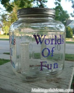 Last, we are saving up to take a trip to Worlds of Fun this summer! Woot! So I got an old jar from Grandma’s basement and we put some more vinyl lettering on it to keep up our motivation to collect change. (So far, we have a little over 2 dollars in it!)