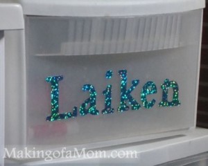 My next 2 projects were made with the sparkle vinyl I got from Pick Your Plum! In our bathroom, we each have our own drawer with our hair brush, Chap Stick, lotion, etc. The girls wanted their names on their drawers, so I had the perfect opportunity to use both my Cricut and my new vinyl! Look at those sparkles!