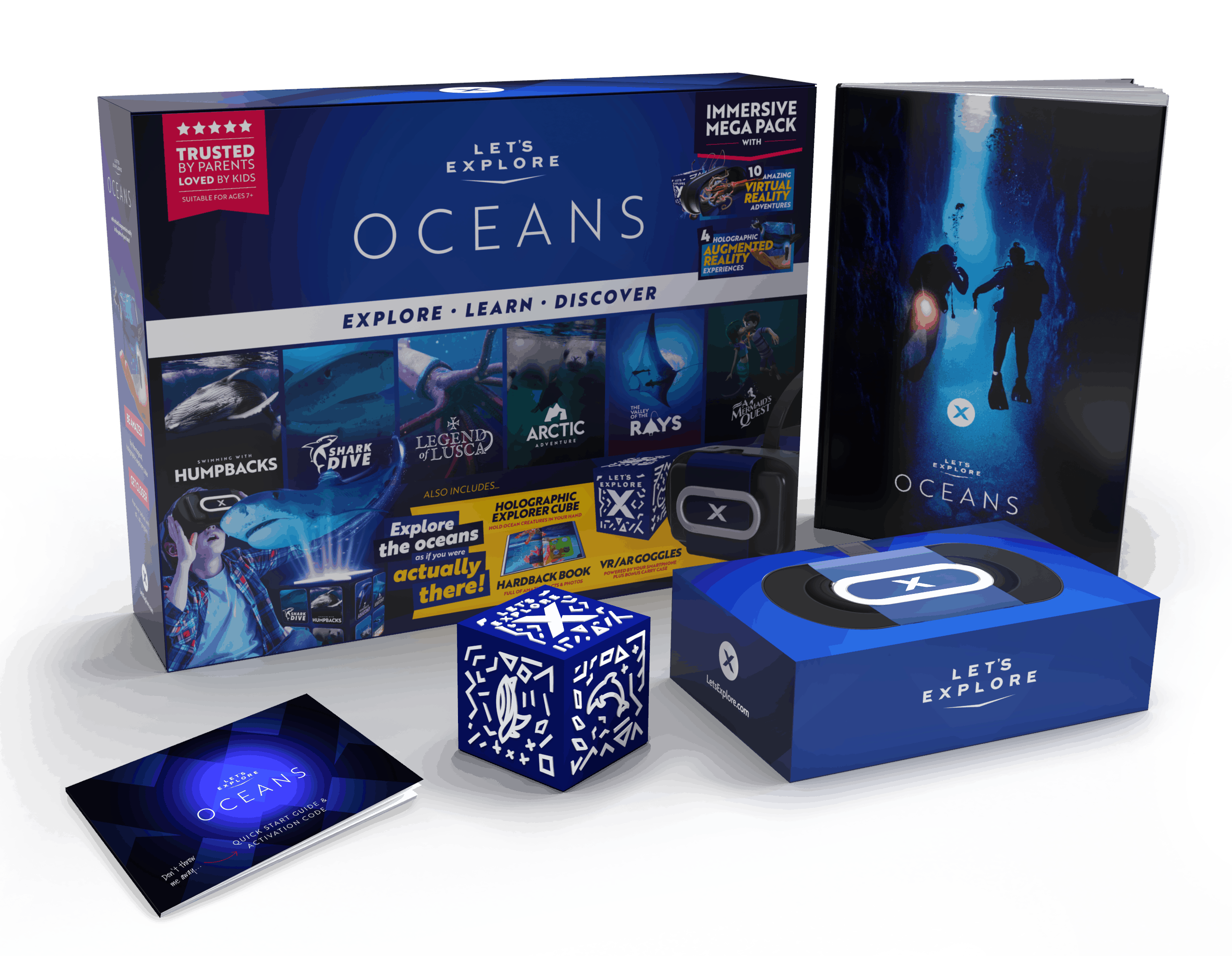 Setting up the Let’s Explore experience is easy. Everything is ready in the box! There are instructions for popping the goggles into place and how to insert your phone and putting it into focus. After downloading the Explore app and typing in the code from the box, you are ready to go! The little cube you see in the picture is the magical device that brings it all to life. In the Let’s Explore Oceans pack there are six VR adventures, four mini-movies and four AR experiences. By rotating the cube, which is really the menu when you have the goggles on, you can pick which adventure you are ready to be immersed in.