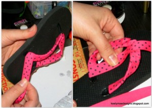 Repeat the same steps for the second flip flop, starting from the outside of the flip flop. When you have completed lining your flip flops with ribbon, they will resemble the photo.
