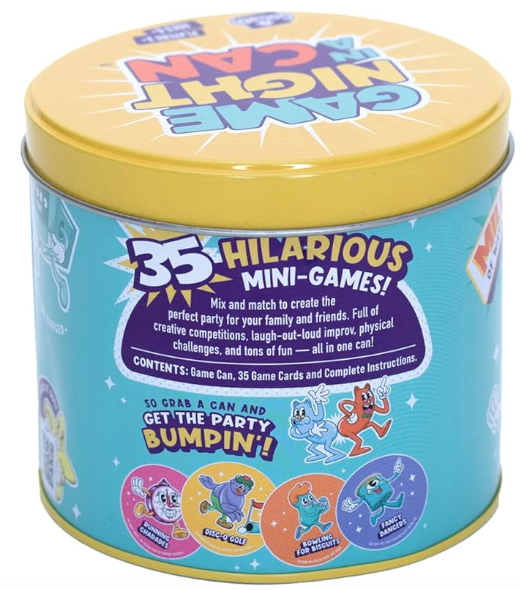 For ages 3+ Game Night in a Can is a fun game for the whole family. Compete in mini games with lots of different activities! This is great for a party or get together. The cute little can is perfect for a stocking!