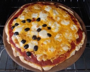 One of our favorite quick and easy meals is “homemade” pizza. Since I am the poster-girl for lazy cooking, I use Pillsbury pizza dough. All I have to do is unroll it and shape it to the pizza stone. Then I add some pizza sauce- either from a can or just add some Italian seasoning to tomato sauce. I get the mozzarella cheese that is gooey and just glob it on the sauce, then sprinkle shredded cheddar around. Last, we add olives to part of the pizza for my oldest daughter. Voila! Incredibly easy and super yummy!!