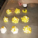To make swirls you will need gel food coloring, painted into a piping bag. We used yellow and orange, so we could also add lemon and orange zest to the meringues. TIP: only paint 2 stripes, that will make enough color when you are swirling them!)