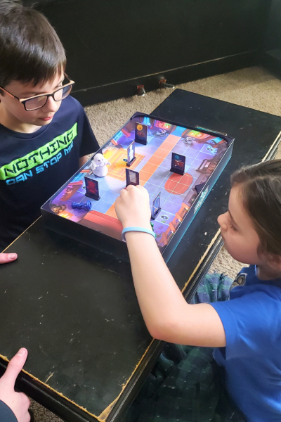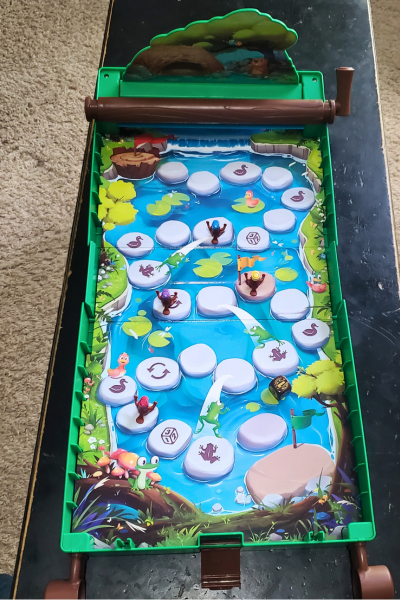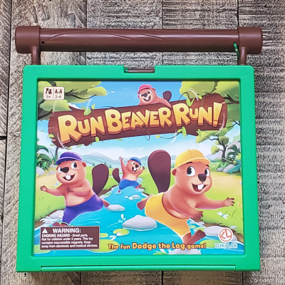 The funny thing about playing this game was that as soon as the first log rolled and took my beaver with it, and they realized there were magnets involved (we all assumed it would just knock the beavers back to start) the boys started trying to figure out there the magnets in the log were and what they could do to avoid it. We’ve previously learned about magnets in science so they were excited about figuring out how to beat the game. A lot of luck in involved, so I’m not sure they’ll be able to figure out how to beat the magnet, but it was fun for them to start exploring different options. This game is reminiscent of shoots and ladders with a lot of up the board and back down again. It can be quick depending on your luck, or it can be slow going.