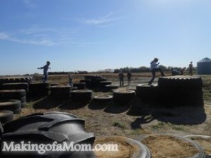 We take a hayrack ride, and then we spend some time in the tire graveyard and playground, and then we play in the corn pit.