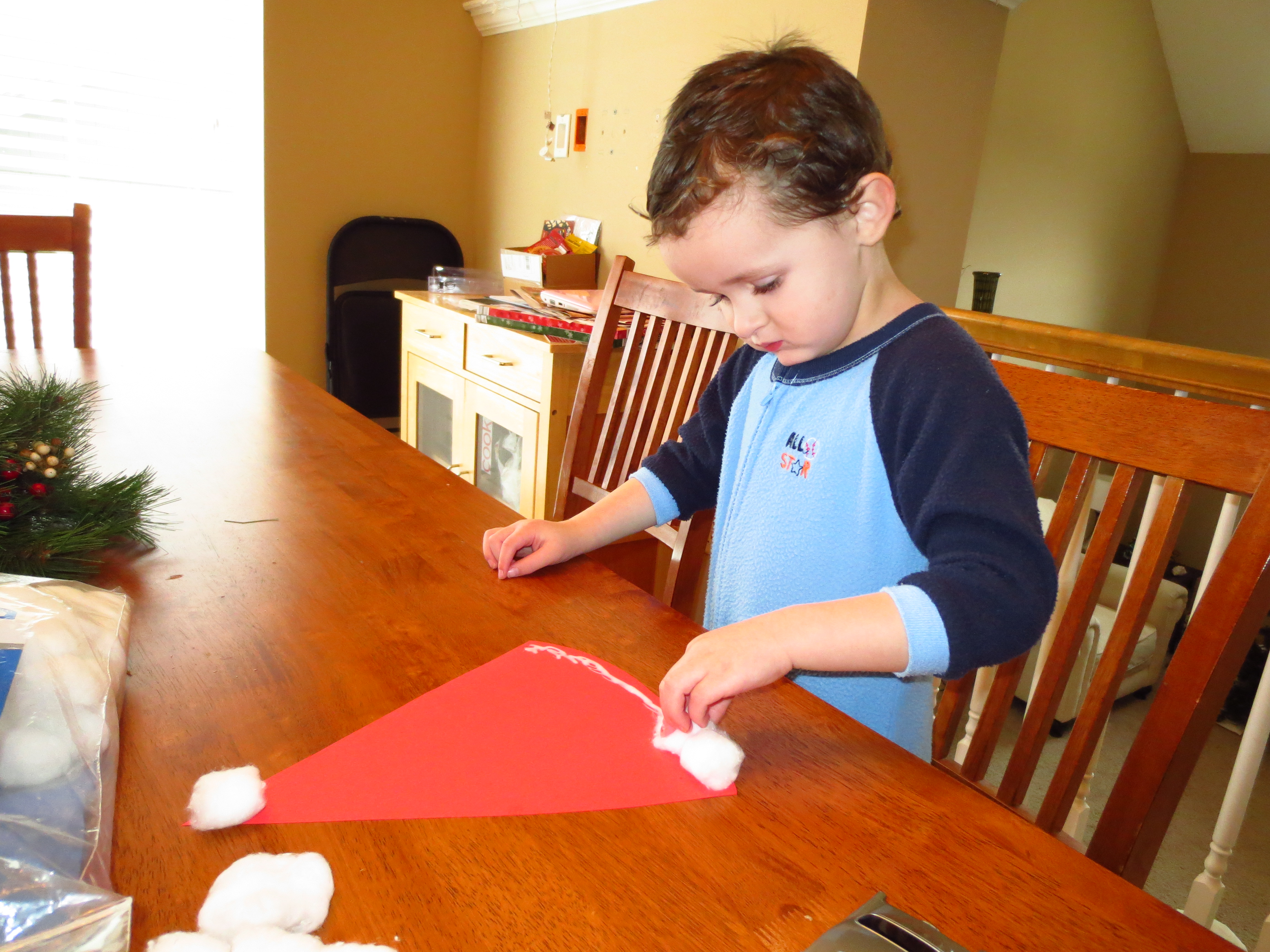 First we made Santa hats. This is super easy, all you need is red construction paper,cotton balls and glue.