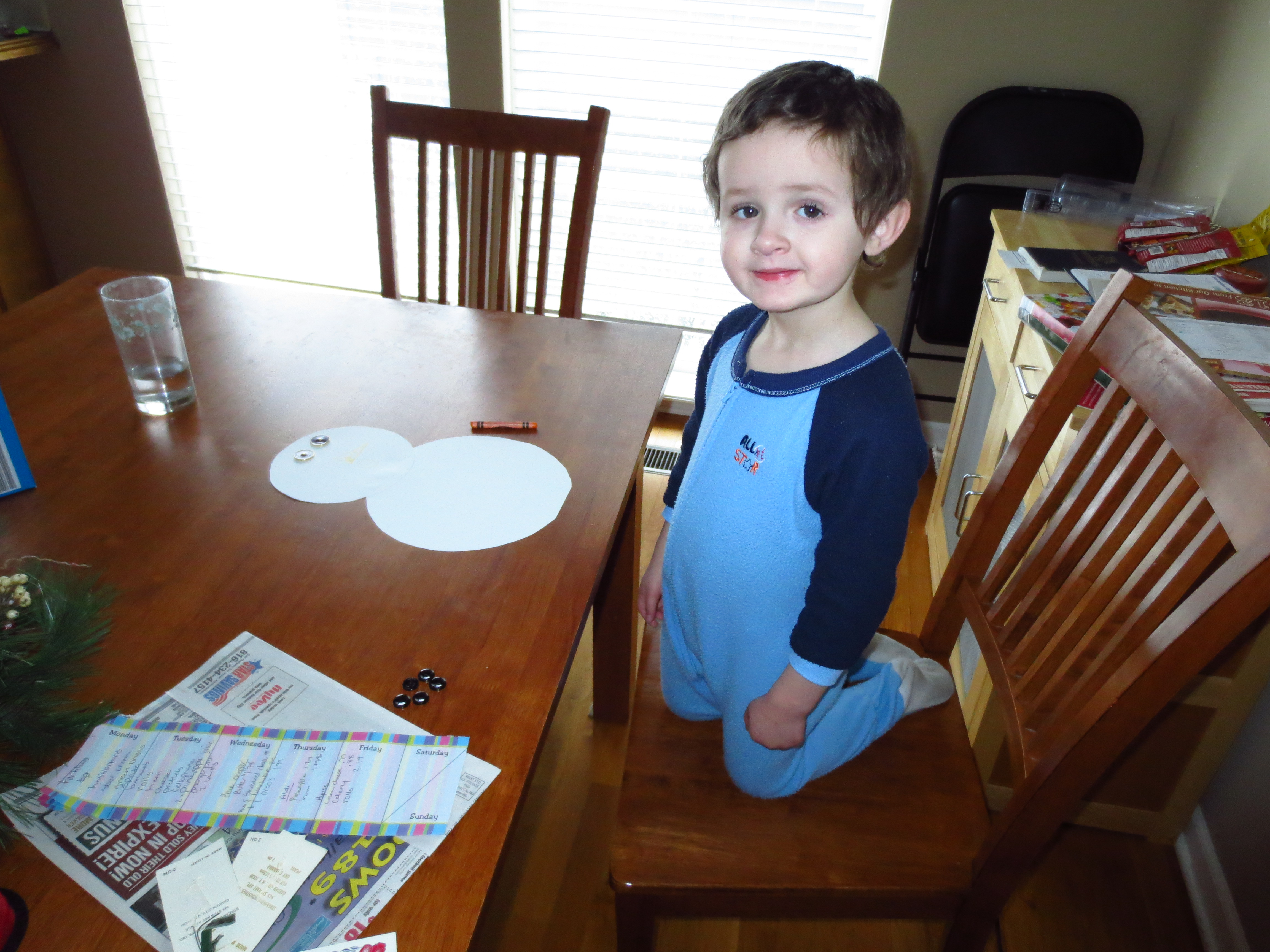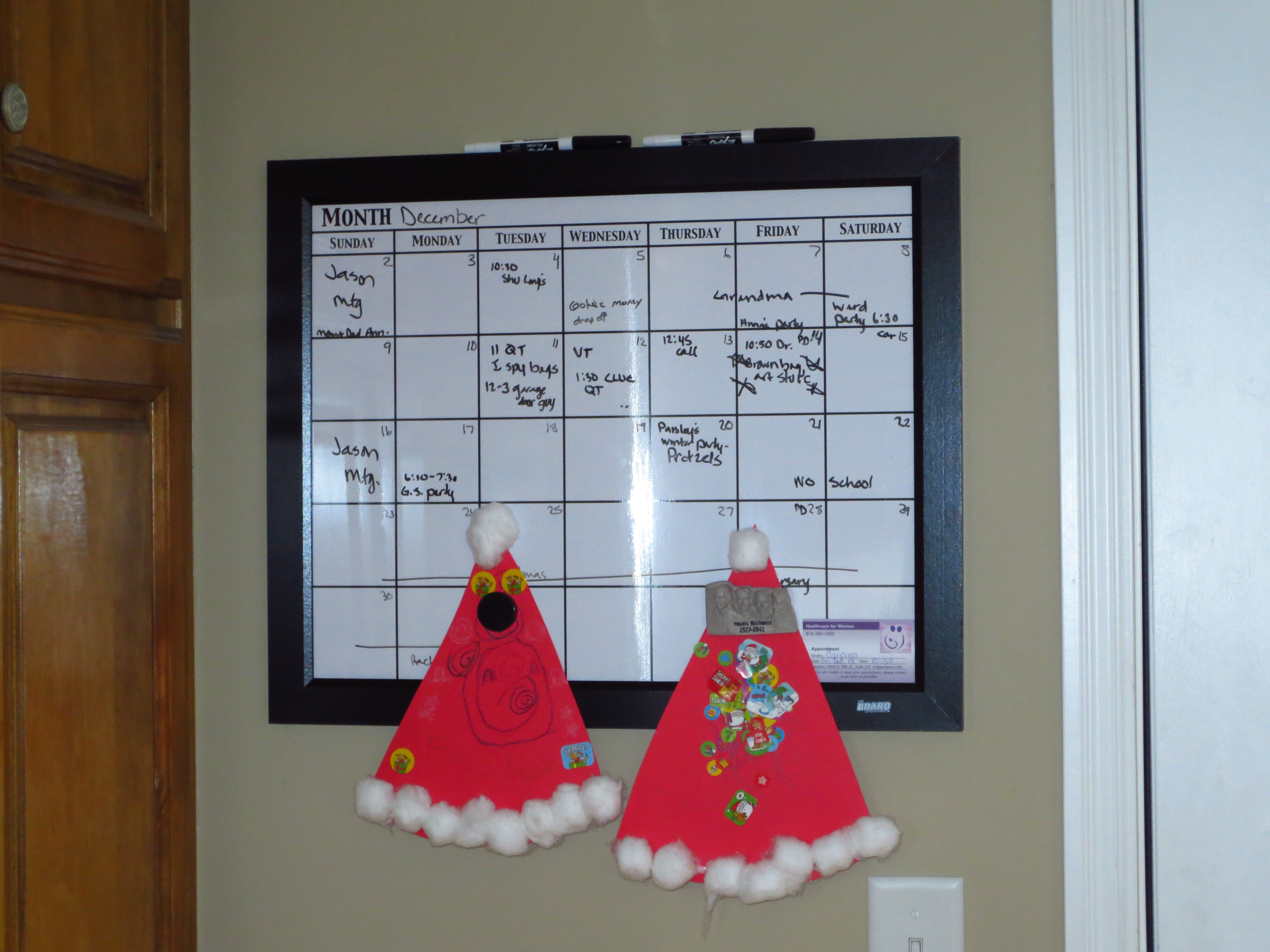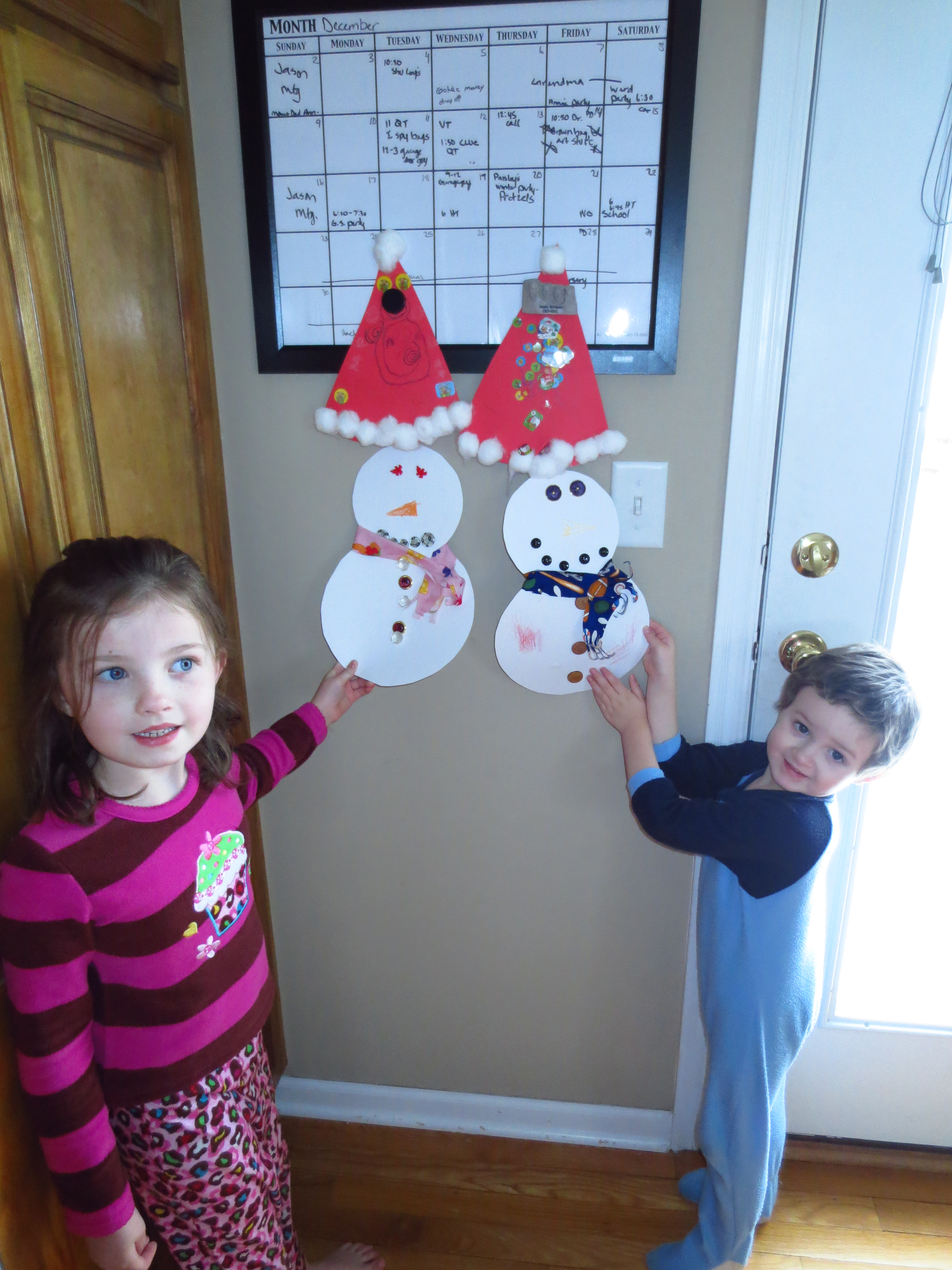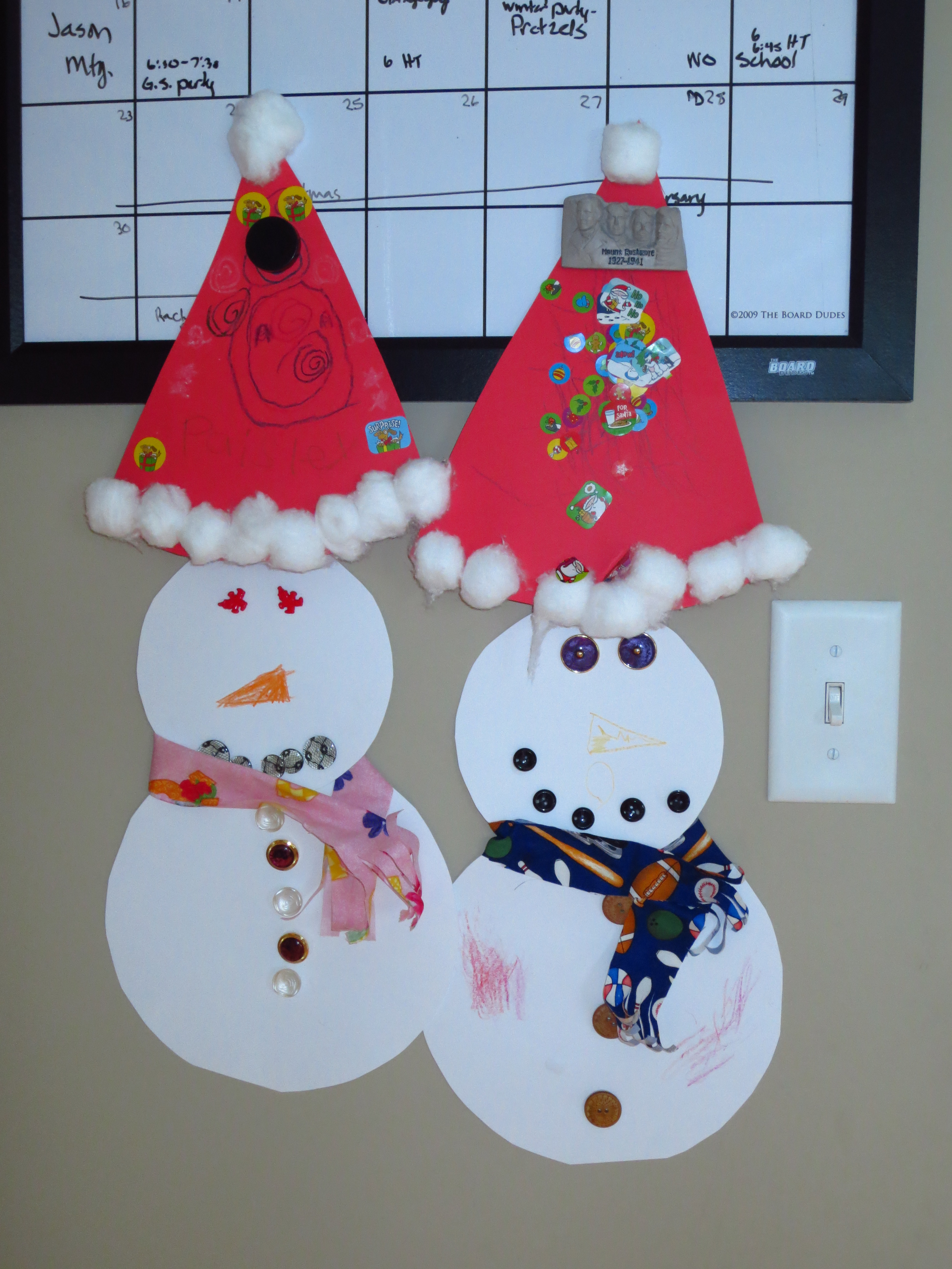We glued buttons on for eyes, mouth and on the snowman’s jacket. We colored on a carrot nose. I cut up scraps of fabric and added a scarf for each snowman. The kids thought it would be fun for the snowmen to wear their Santa hats, so I taped them to the wall under their Santa hats. We have had some fun craft days this week!