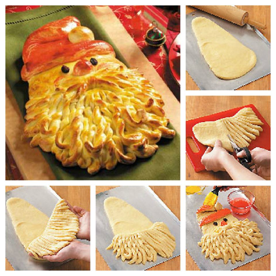 Use the remaining dough for the mustache, nose, hat pom-pom and brim. Shape a portion of dough into a mustache; flatten and cut the ends into small strips with scissors. Place above beard. Place a small ball above mustache for nose. Fold tip of hat over and add another ball for pom-pom. Roll out a narrow piece of dough to create a hat brim; position under hat.