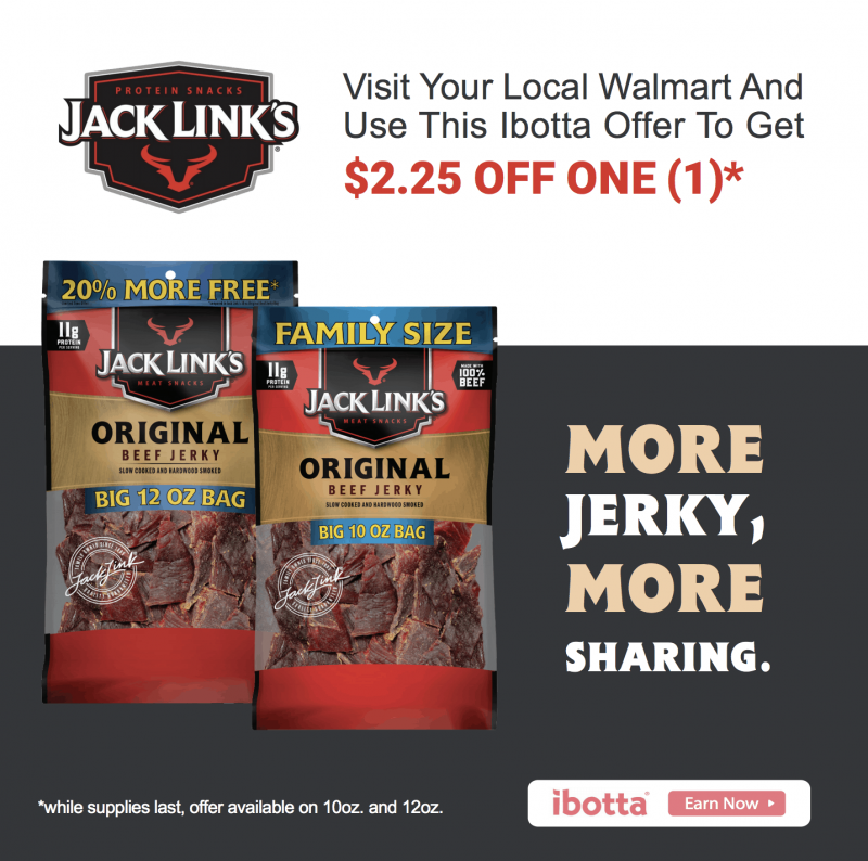 Who doesn’t love Jack Link’s Beef Jerky?! It’s made with 100% Beef, offers 11g of protein per serving, tastes amazing, and now, you get 20% more when purchasing the NEW 12oz. bag!! Whether you’re on-the-go during busy days, powering thru work or snacking with the whole family at home, Jack Link’s Beef Jerky is perfect for every occasion. Visit your local Walmart and use this Ibotta offer to get $2.25 off one (1)*!