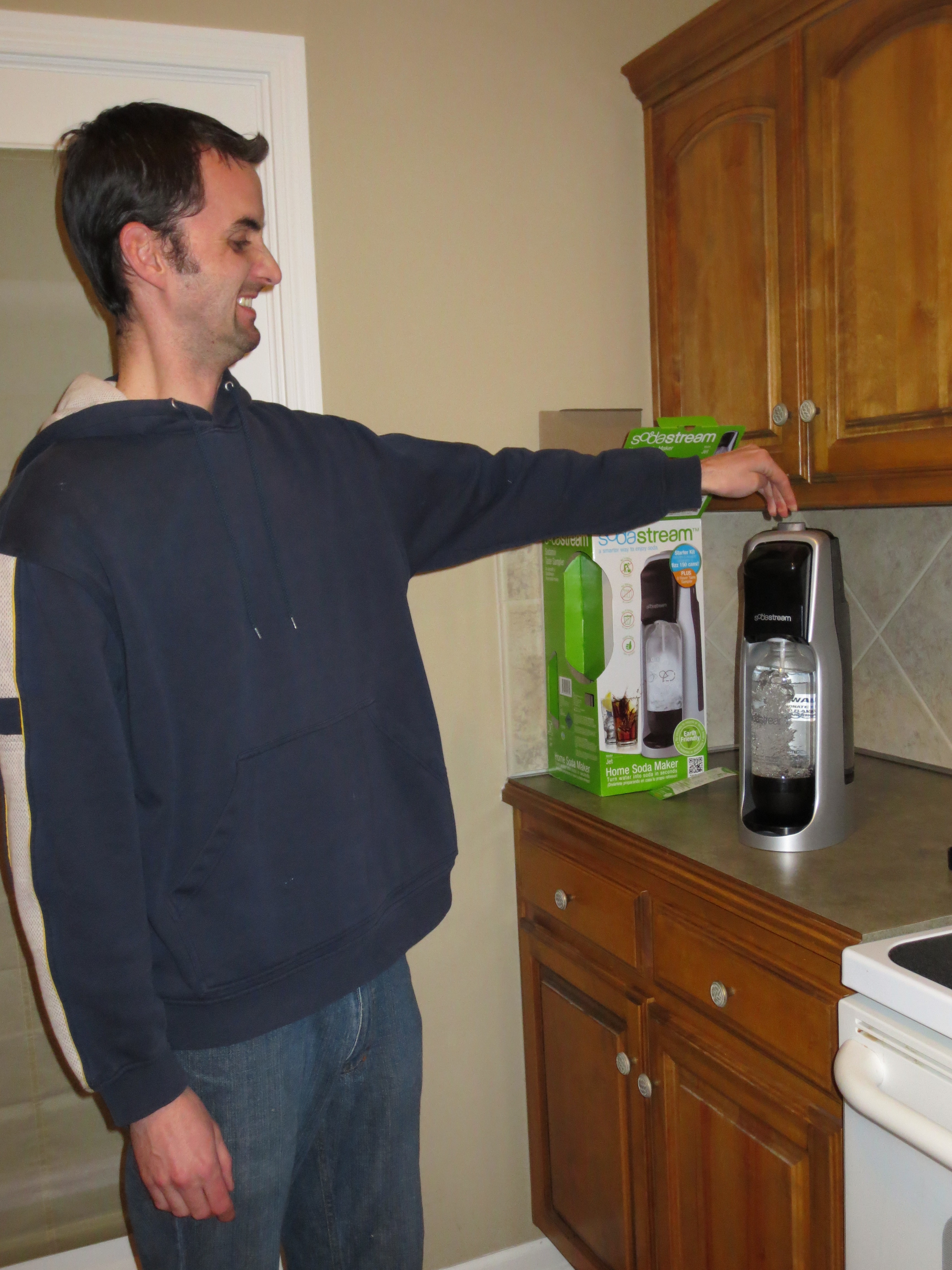 So how does the Sodastream work? It is really easy and fast. You attach the carbonator into the back of the machine. You then take your chilled liter bottle of water and screw it into the front of the machine. After about 30 seconds of pressing and quickly releasing the carbonation button on the top of the machine, you will hear a loud buzz, you then press the button two more times, making two more buzzes. The water is then carbonated to a normal amount. If you like your beverages super fizzy, you can press the button a few more times for a super fizz! Once your water is done being carbonated you pour the correct amount of flavor into the bottle while tilting it sideways. Screw on the cap and mix by swirling the bottle to make sure you get an even flavor. And DONE, a yummy soda is ready for the consuming! (You can see my husband was a little nervous to push the button for the first time!)