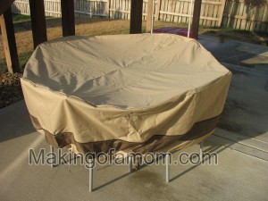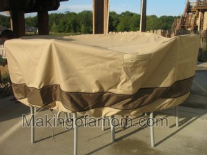 The other awesome thing about this cover is that it is big enough that you can push your chair up to the table and have it cover those as well! I LOVE this table cover. I love that everything is thoroughly covered and protected from the elements. The fabric of this table cover is thick to withstand anything!