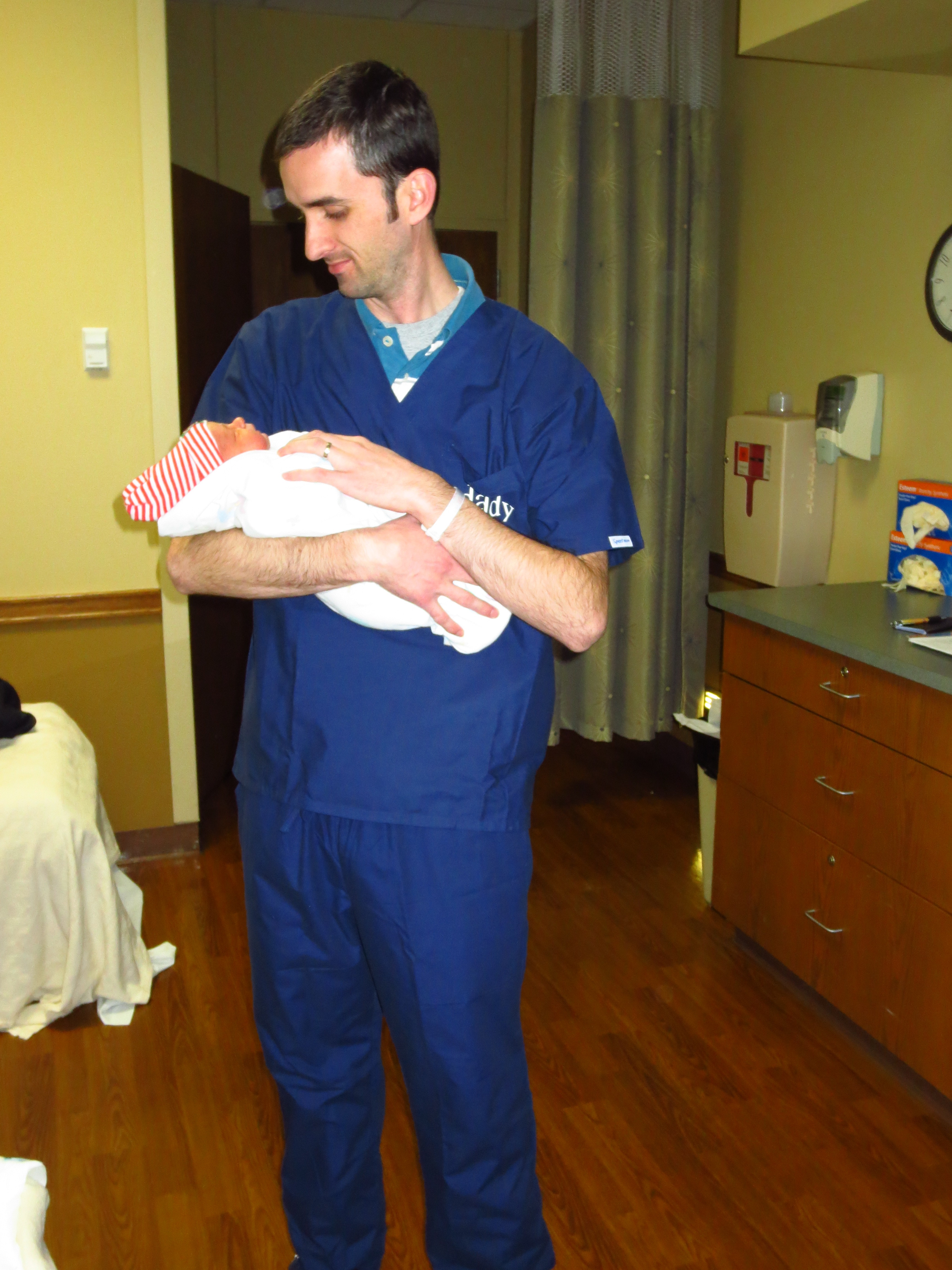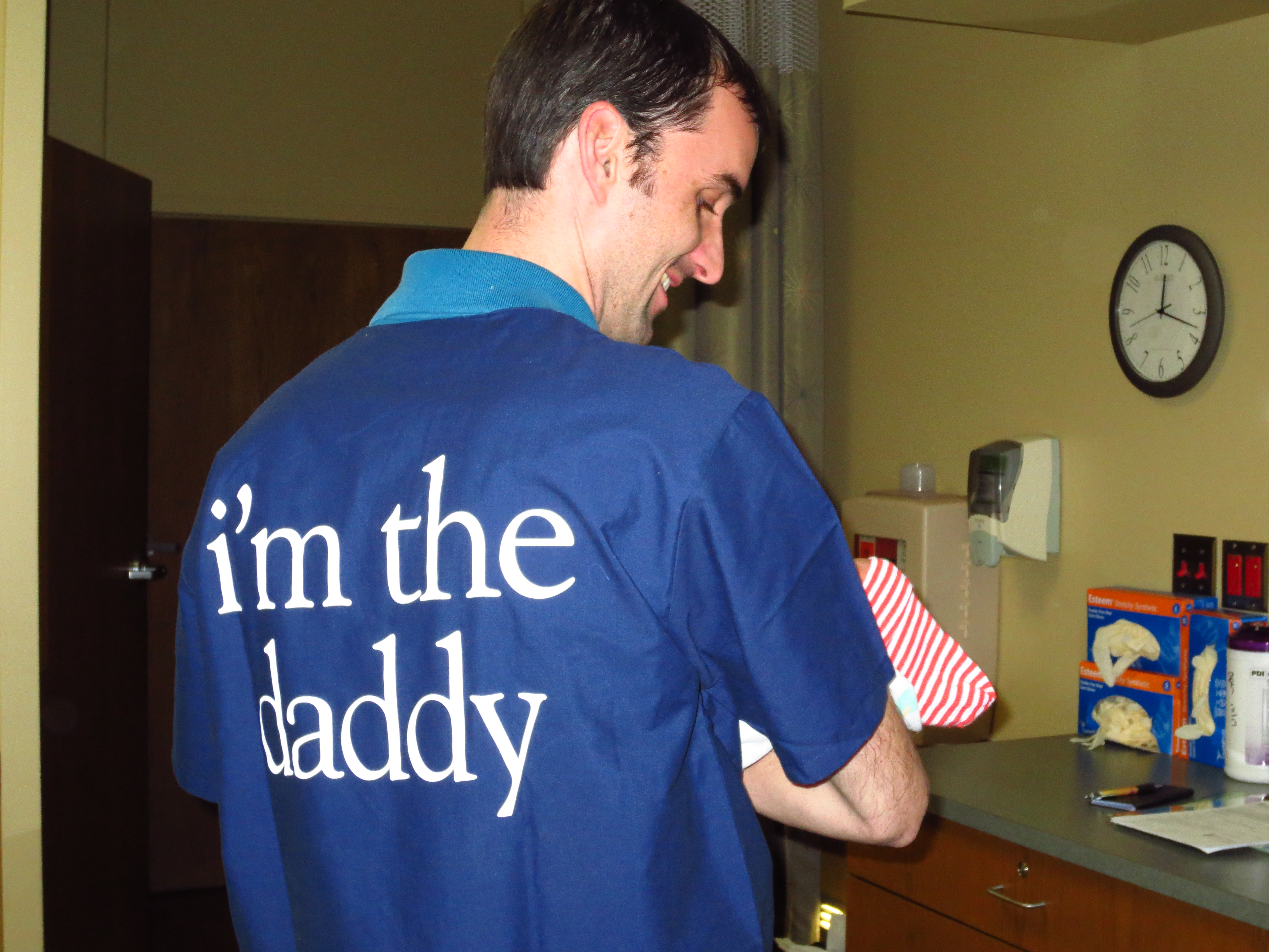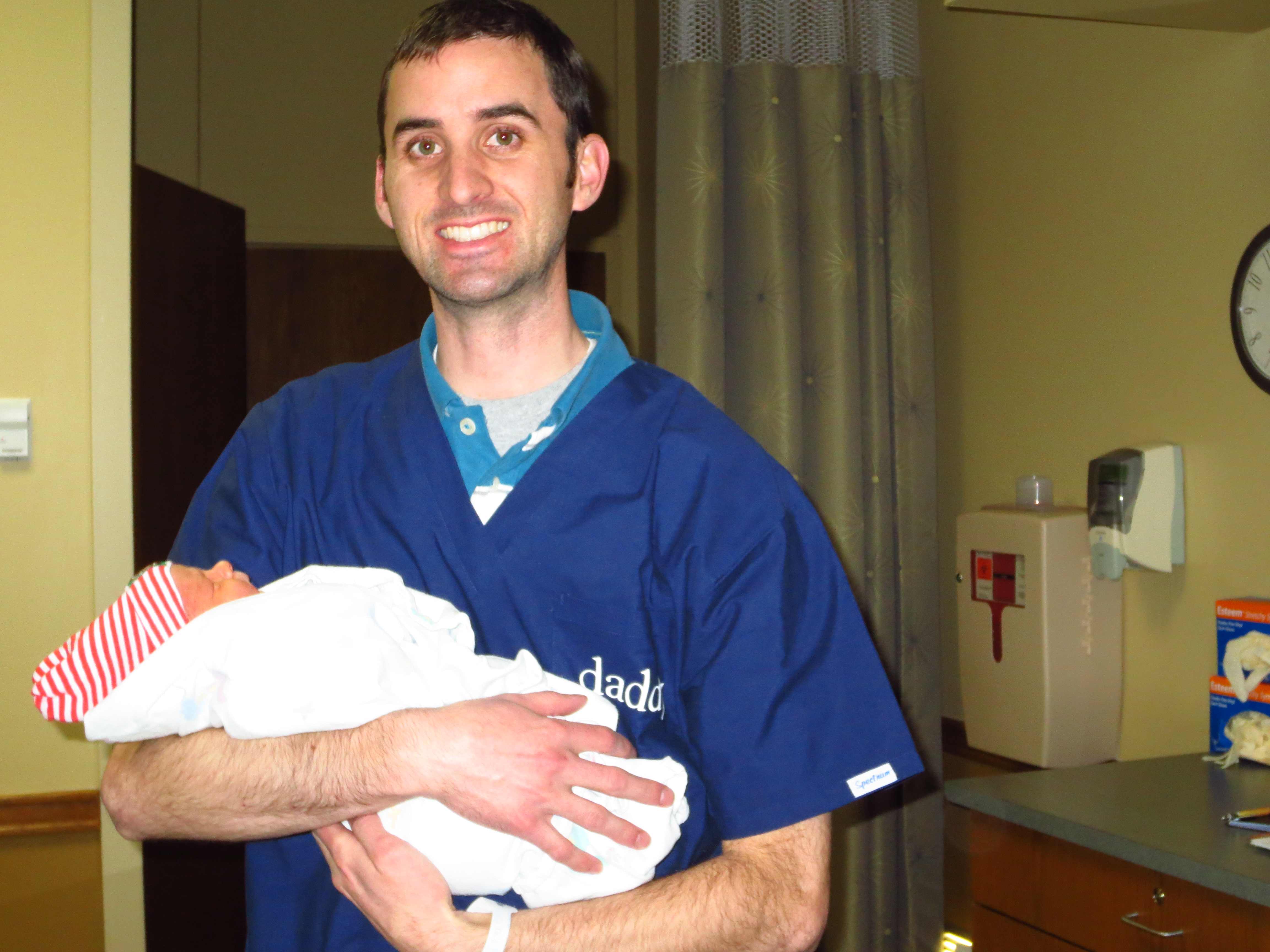 We got these cute DaddyScrubs the day before I went into labor! I was due on January 8th, but scheduled to be induced on Jan.2. Well December 27th rolled around and I was having contractions all day and I knew that the baby would be coming soon. I was worried these cute scrubs wouldn’t make it in time but they showed u in the knick of time!! The night of the 27th the mailman was working late they got delivered. The morning of the 28th (my 10th wedding Anniversary, by chance!) we went to the hospital at 5:30am and baby Eli was born at 9am! My husband very cute and proud to sport his Daddy Scrubs! And bonus, he can consider then some new pj’s! If you are soon to have a baby, this would be a fun present to give the Daddy to be!