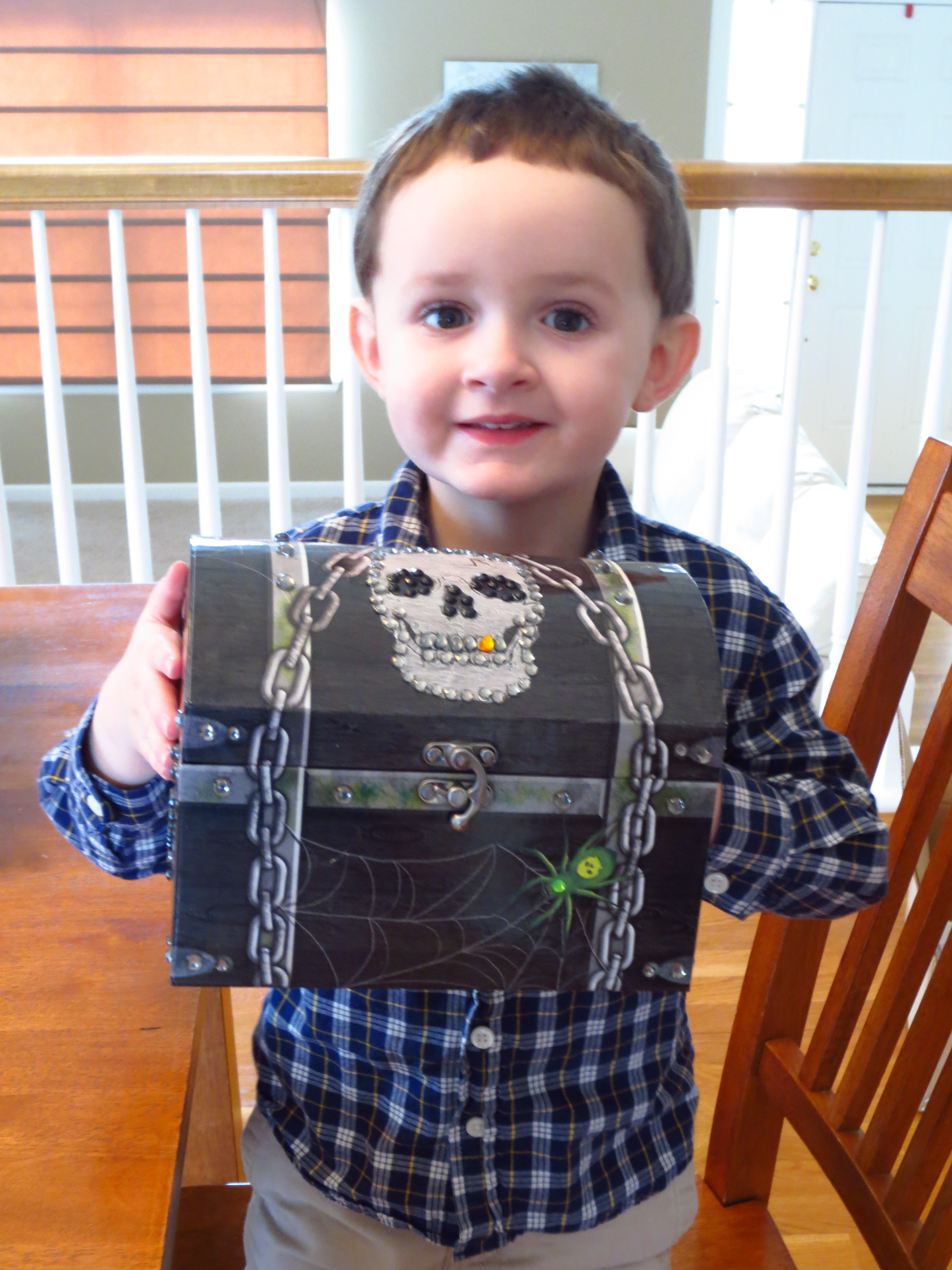 My son now carries his treasure chest around everywhere. He has put some of his “treasure” (cars) inside it.