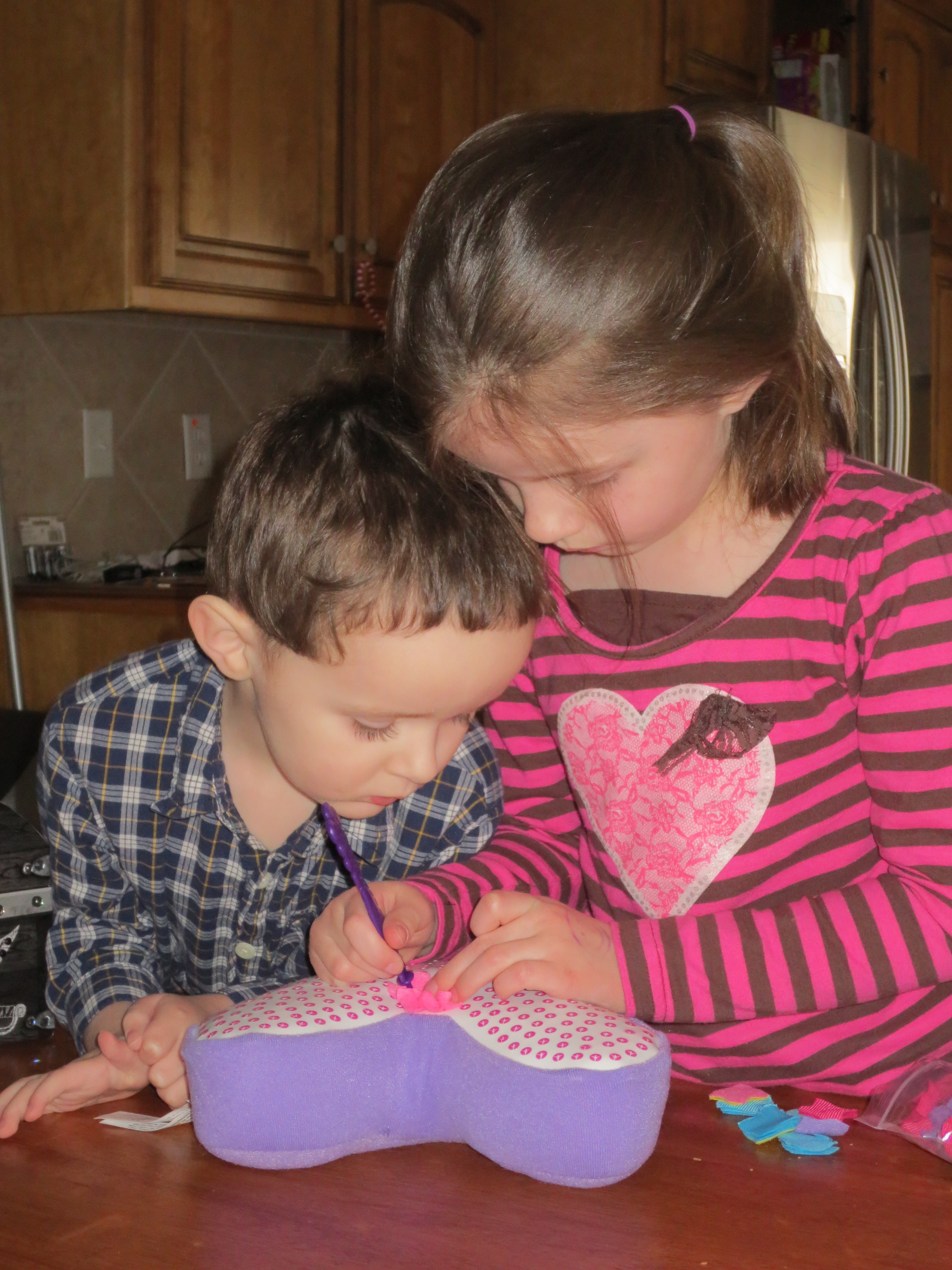 The whole project took a couple hours that were spread throughout the day. She finished it right after bath time and before she headed to bed. She was very proud of her finished pillow.